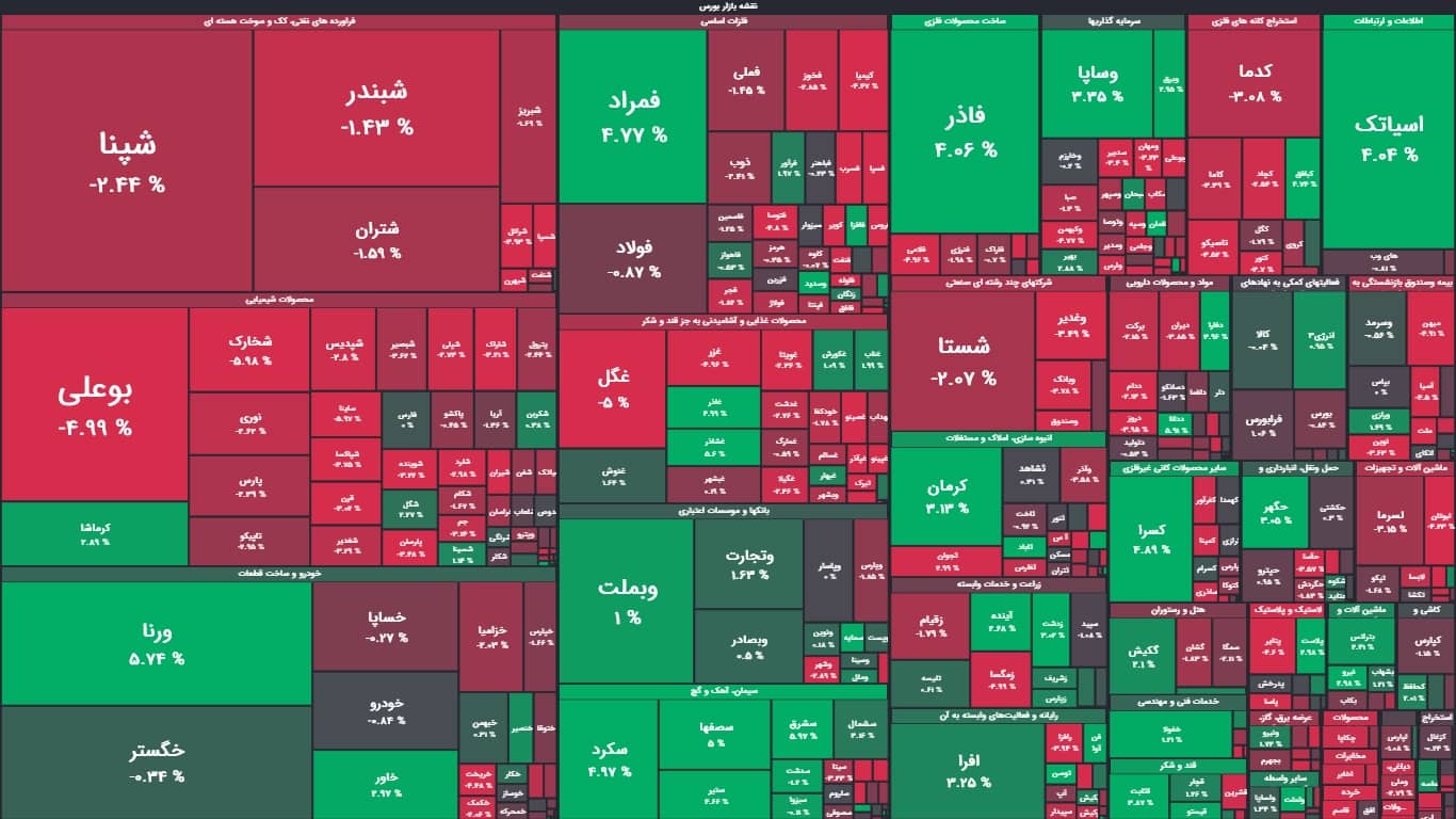 حقیقیها تا ساعت مورد اشاره رقمی در حدود ۱۲۰میلیارد تومان نقدینگی از بازار خارج کردند. نمادهای «آسیاتک»، «شستا»، «شپنا»، «فاذر»، «خگستر»، «شبندر» و «ورنا» در گروه پرتراکنشهای بورس و نماد های «کرمان»، «ددانا»، «حگهر»، «افرا»، «فرئسیل»، «زقیام» و «آریا» در گروه پرتراکنشهای فرابورس قرار گرفتند.